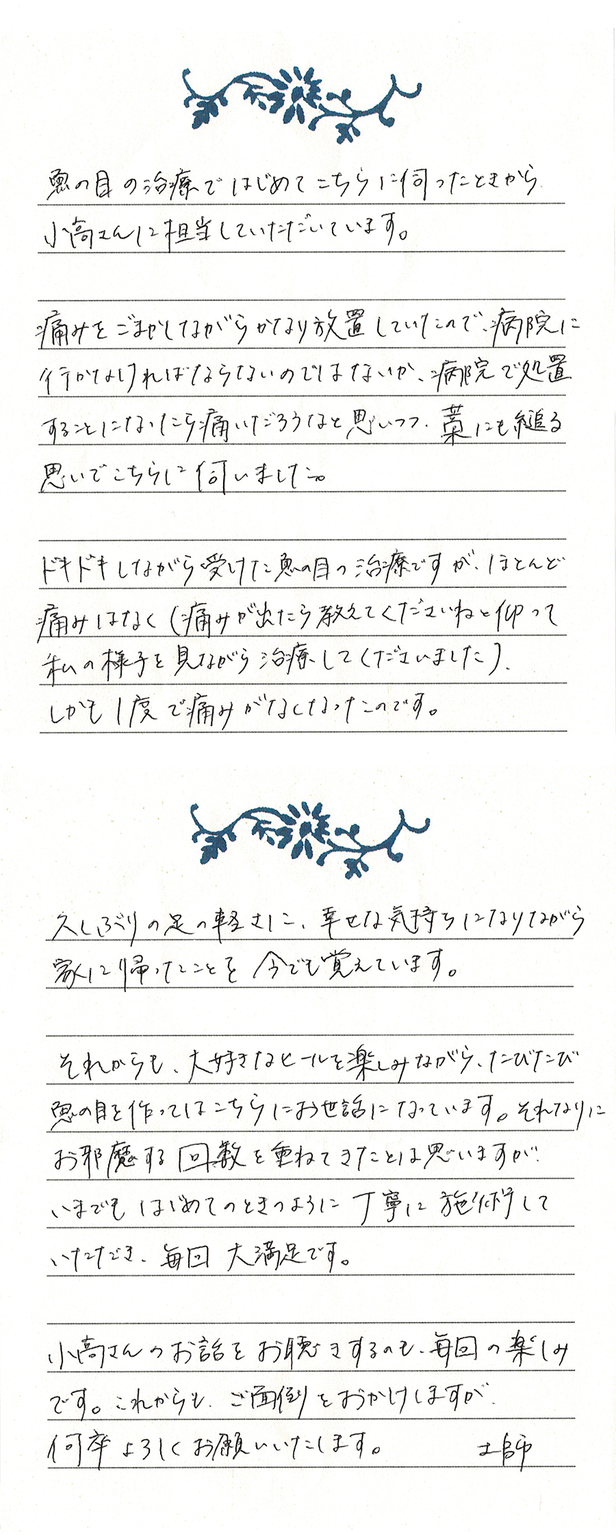 痛みをごまかしながらかなり放置していたので、病院に行かなければならないのではないか、病院で処置することになったら痛いだろうなと思いつつ、藁にも縋る思いでこちらに伺いました。