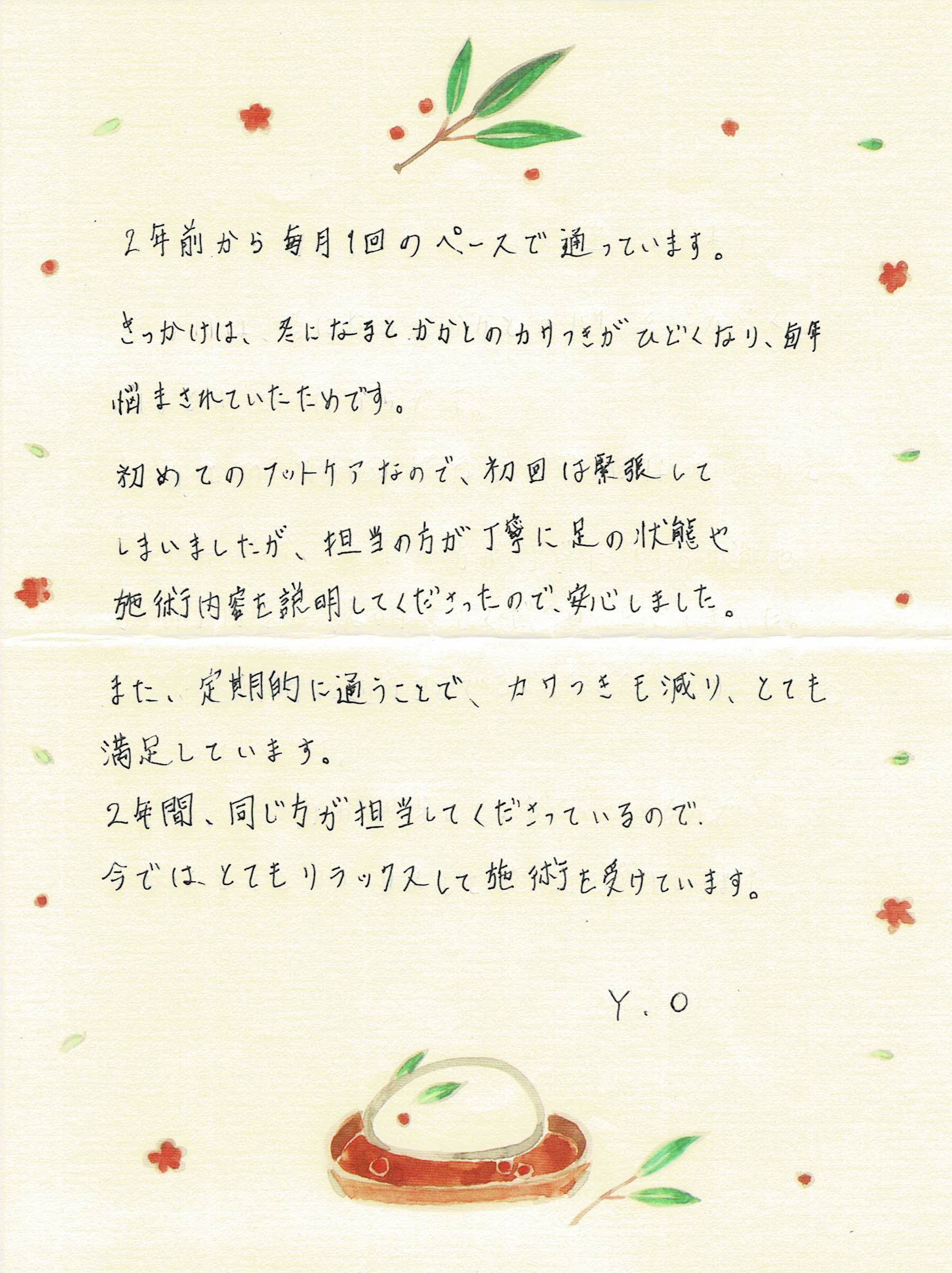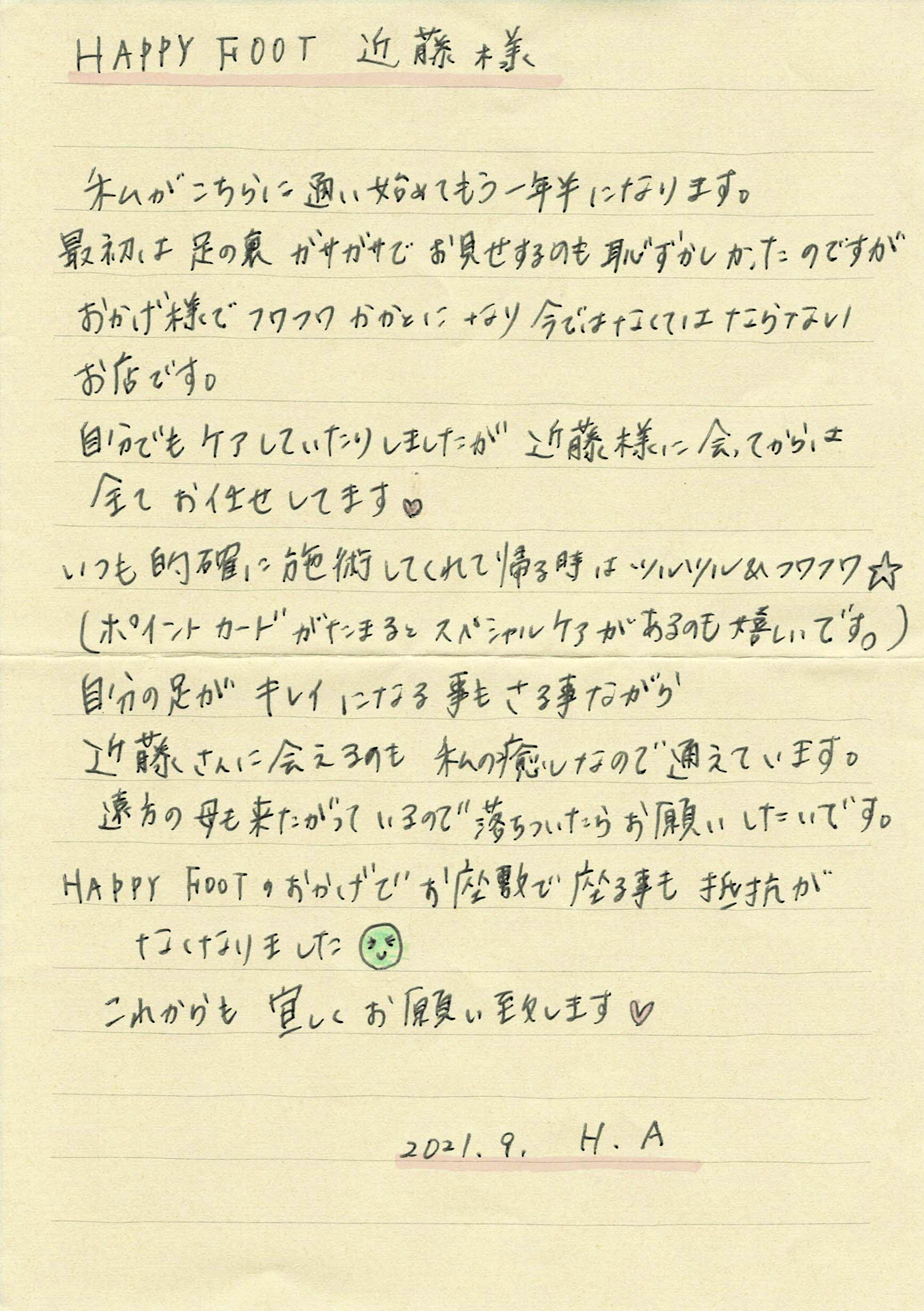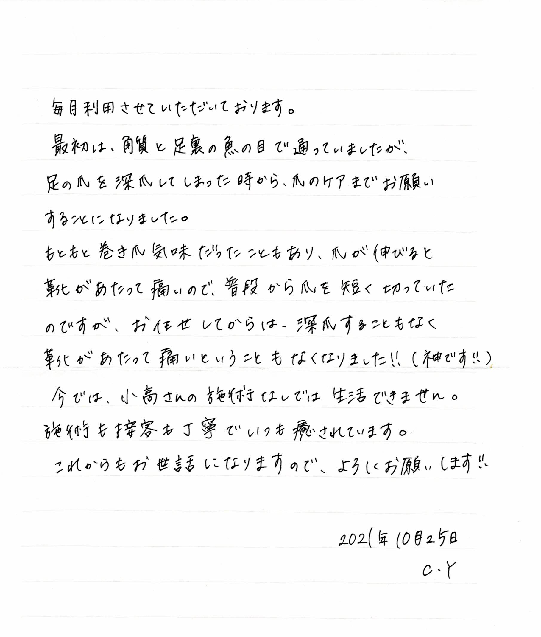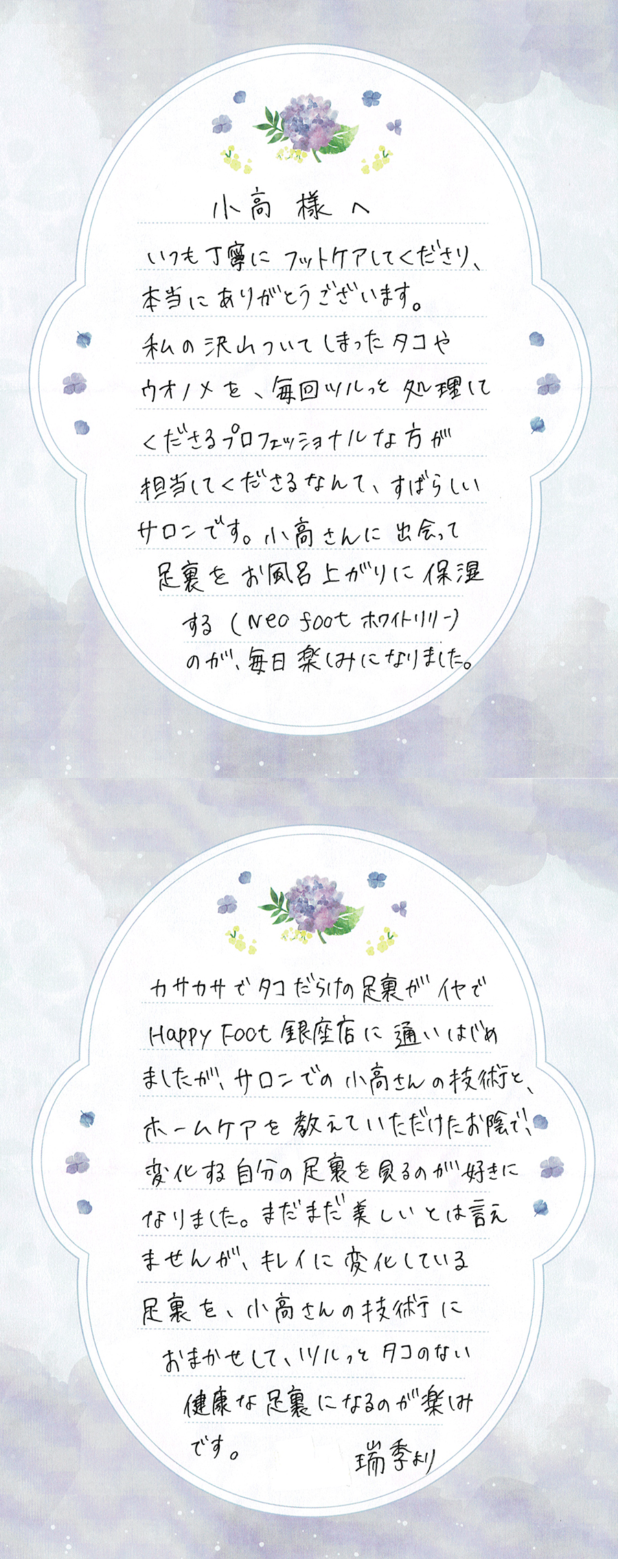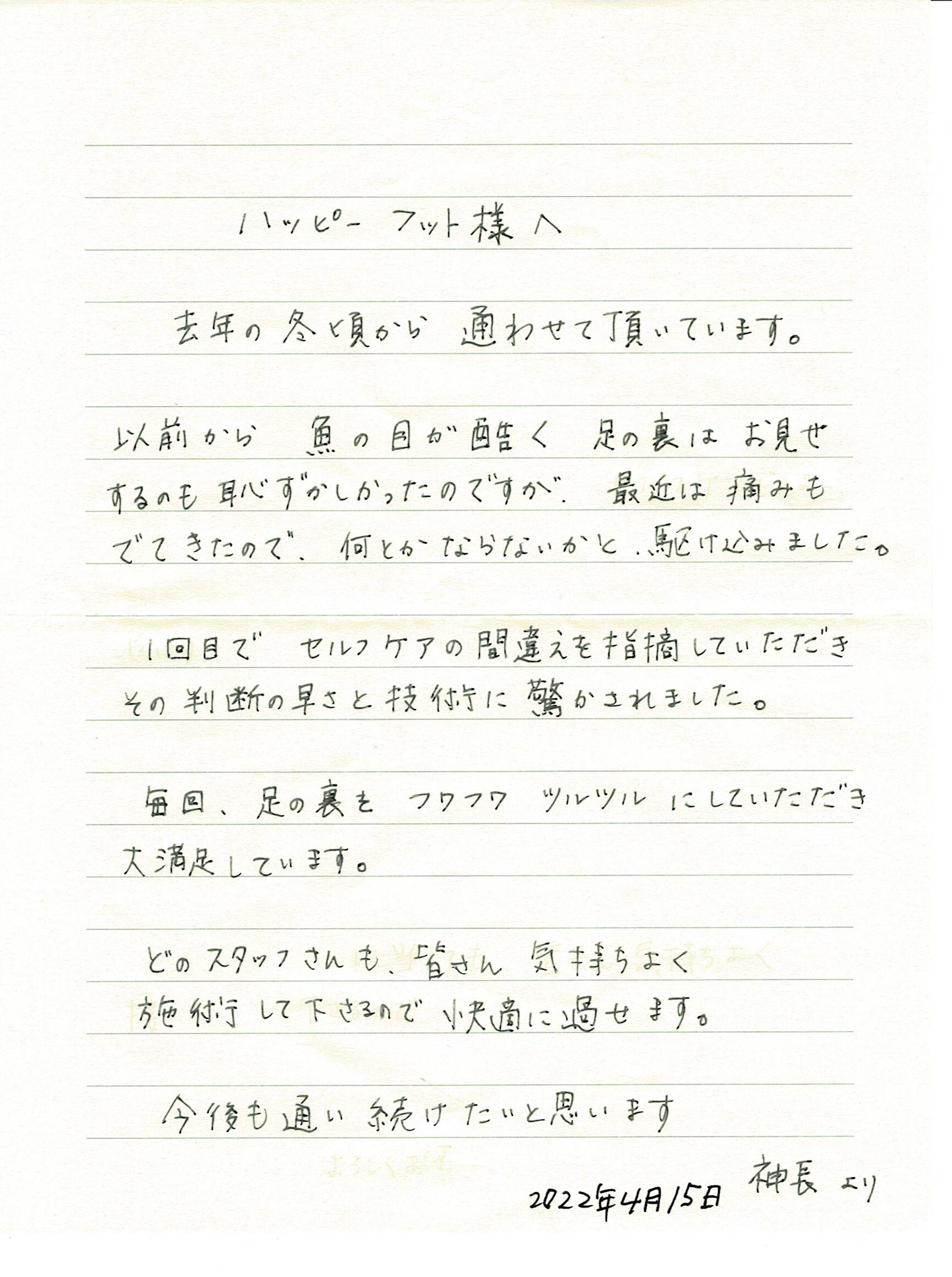 いつも丁寧にフットケアしてくださり、本当にありがとうございます。