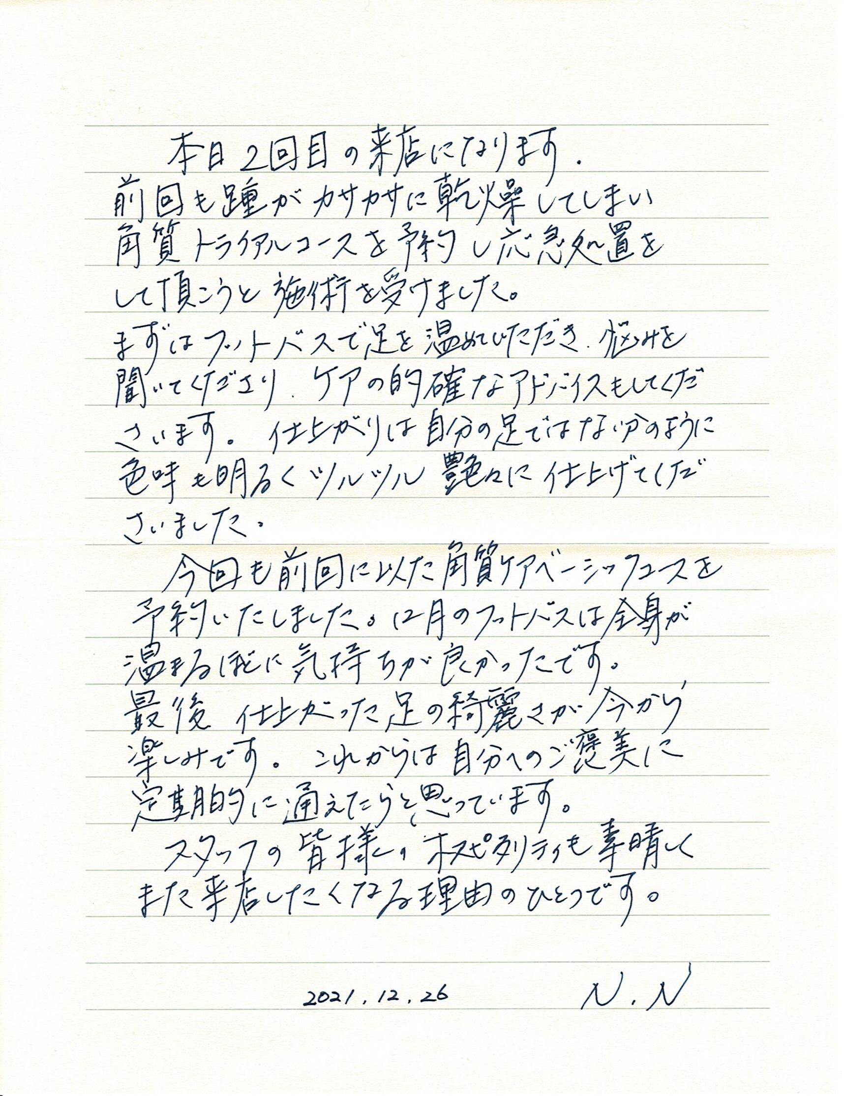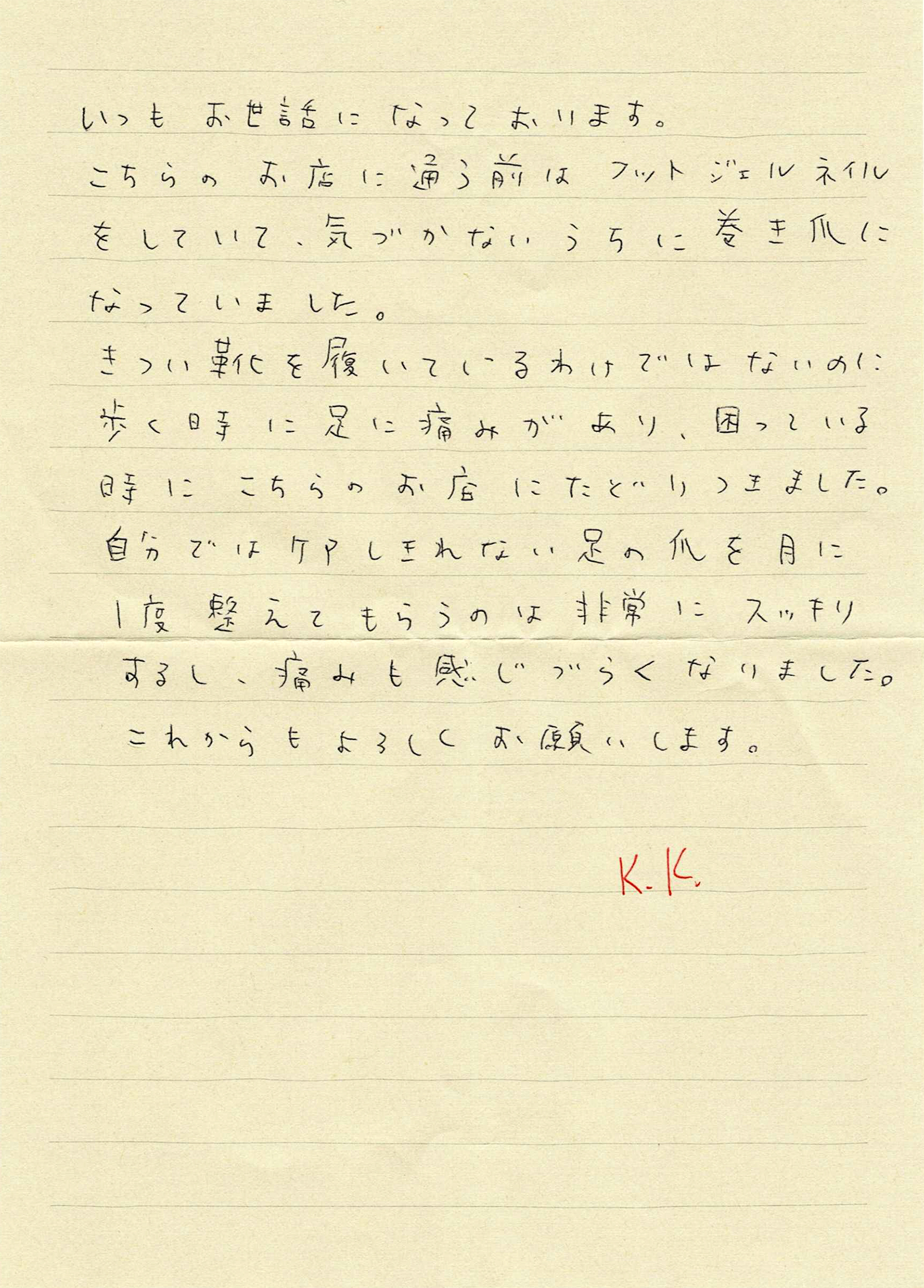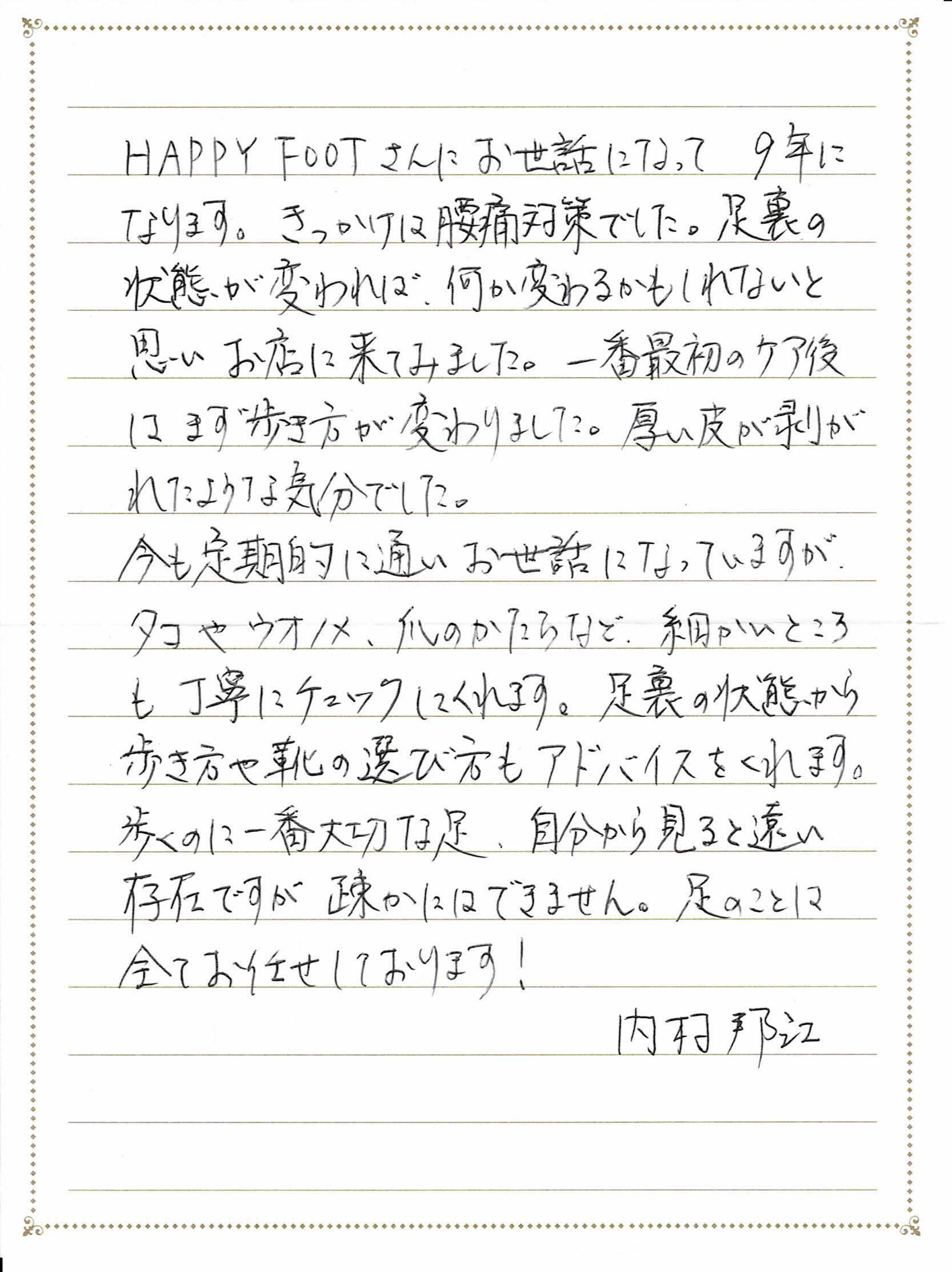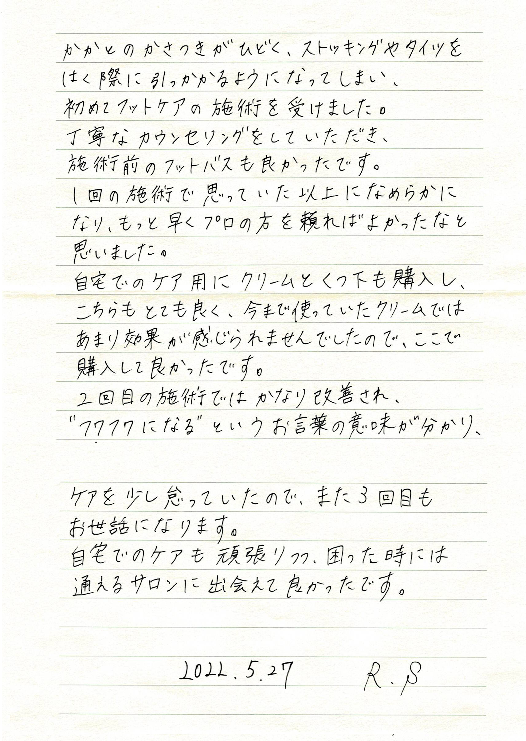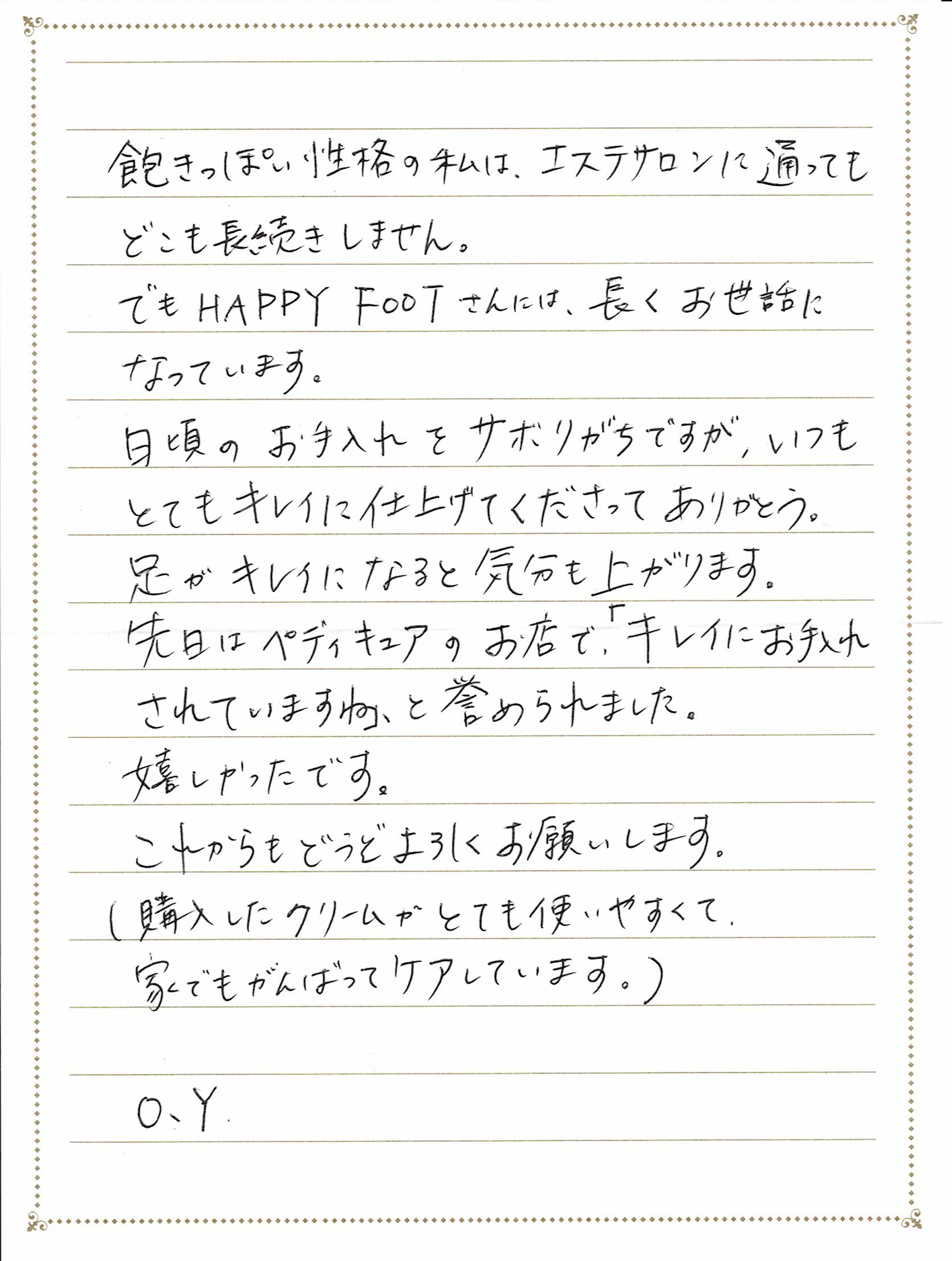 いつも丁寧にフットケアしてくださり、本当にありがとうございます。