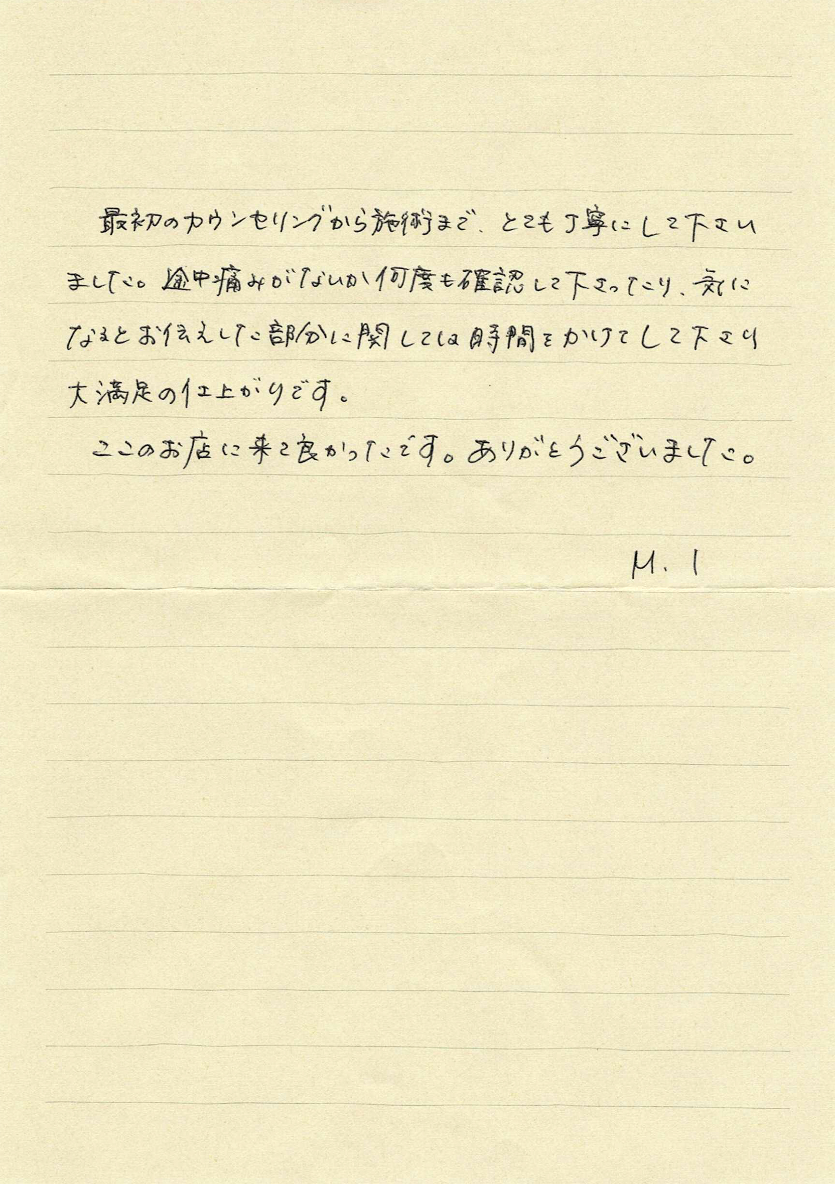 最初のカウンセリングから施術まで、とても丁寧にして下さいました。途中痛みがないか何度も確認して下さったり、気になるとお伝えした部分に関しては時間をかけてして下さり大満足の仕上がりです。