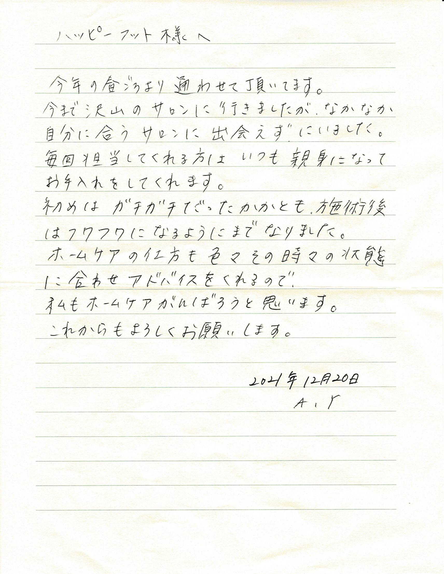今まで沢山のサロンに行きましたが、なかなか自分に合うサロンに出会えずにいました。毎回担当してくれる方は、いつも親身になってお手入れをしてくれます。