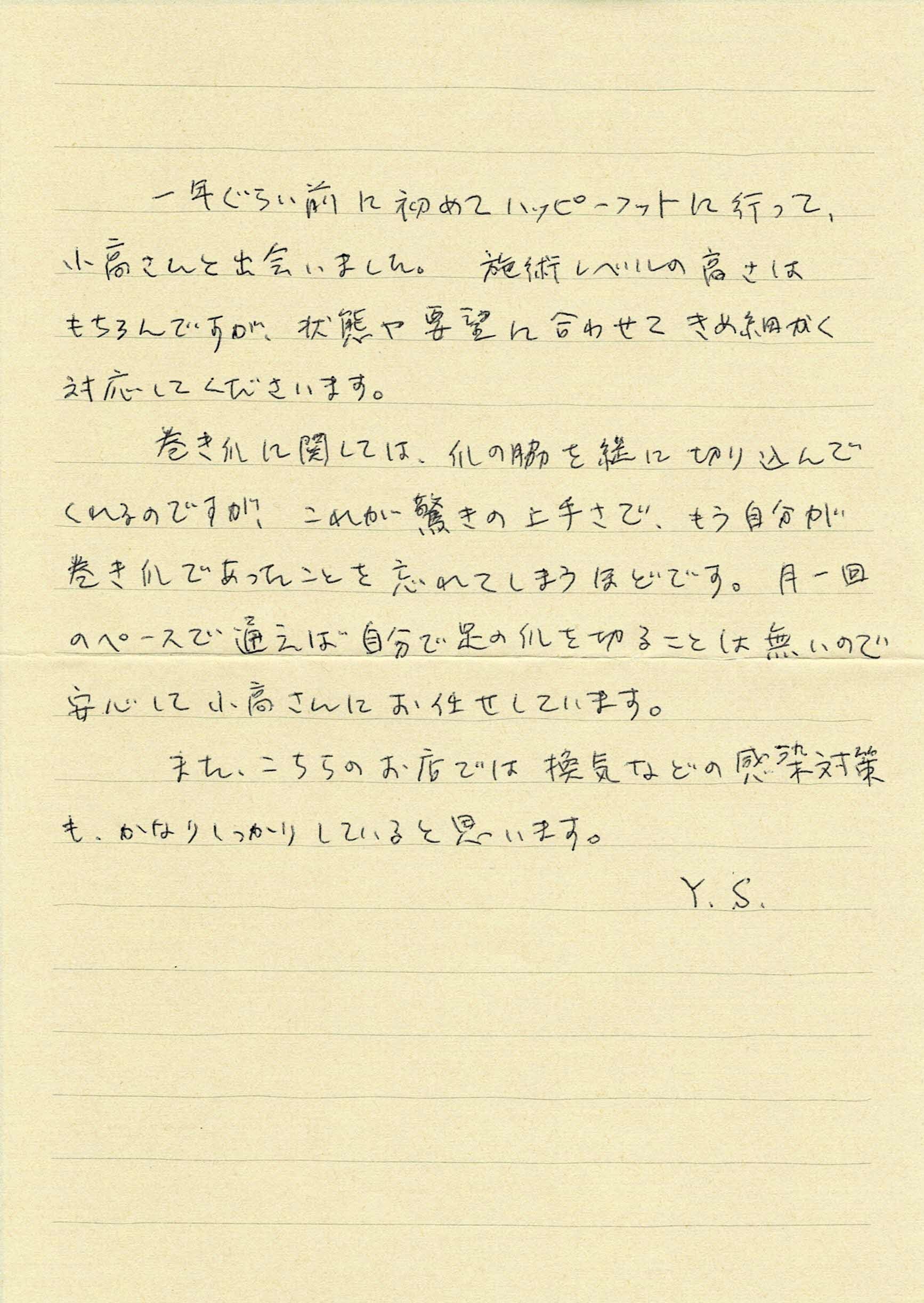 一年ぐらい前に初めてハッピーフットに行って、小高さんと出会いました。施術レベルの高さはもちろんですが、状態や要望に合わせてきめ細かく対応してくださいます。
