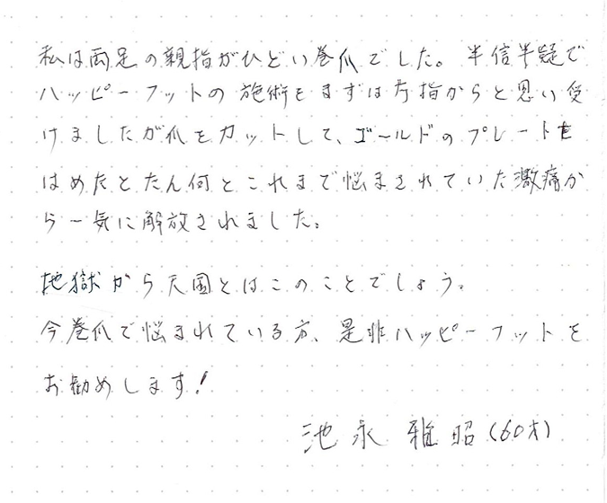 半信半疑でハッピーフットの施術をまずは片指からと思い受けましたが爪をカットして、ゴールドのプレートをはめたとたん何とこれまで悩まされていた激痛から一気に解放されました。