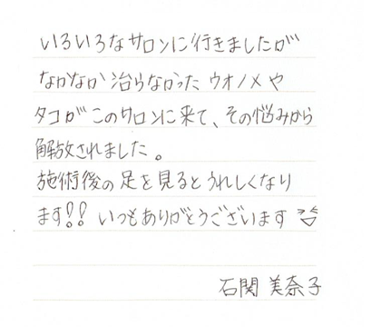 いろいろなサロンに行きましたが、なかなか治らなかったウオノメやタコがこのサロンに来て、その悩みから解放されました。