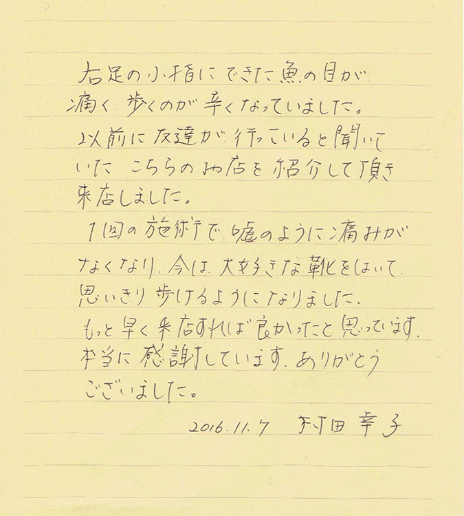 魚の目があったのですが1回目の施術の時に適切に処置して頂いたので今では定期的なお手入れだけで痛くなる事はなくなりました。
